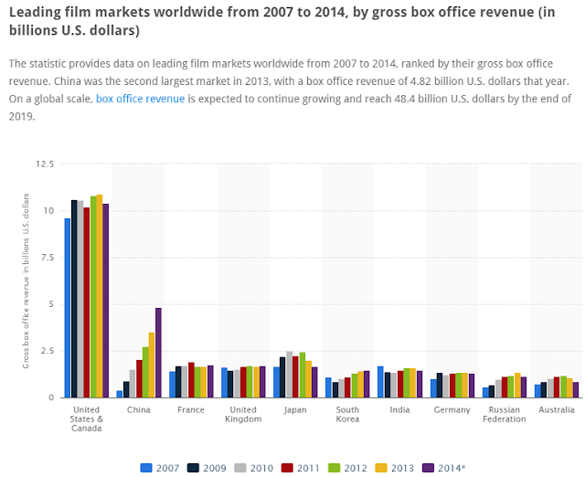 The UK is dwarfed by the US and China, but it, France and Japan are closely matched and are ranked differently depending on the survey/year but is the 3rd, 4th or 5th biggest cinema market in the world, a definite top 5 market. Note how low its share from nationally produced films is - US films account for 4 times the box office of UK-produced films. No figure is given for the US but this would be in the high 90%+ range.
